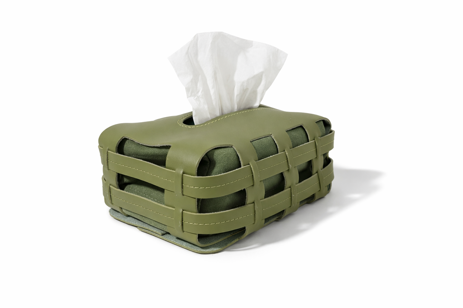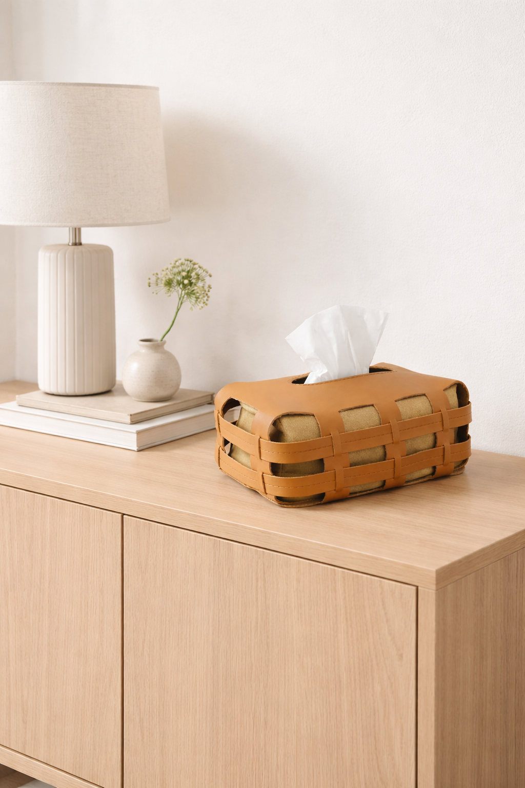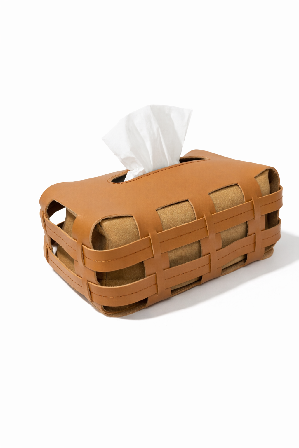 Un guscio morbido in similpelle intrecciata che accoglie i fazzoletti con discrezione. Superficie intrecciata e linee pulite, pensate per restare in vista senza farsi notare.