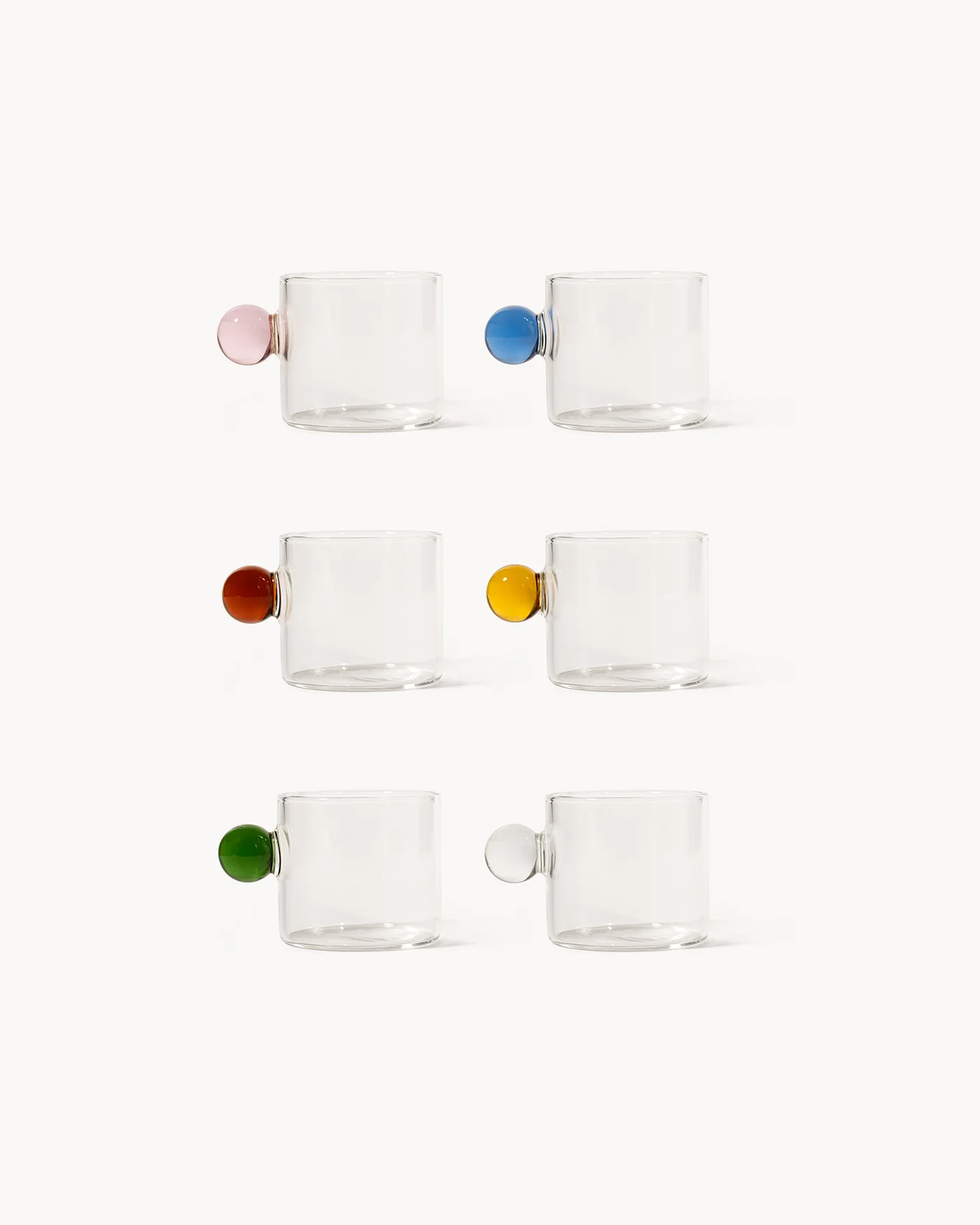 Bevi il tuo caffè preferito con stile grazie al nostro set di 6 tazzine da caffè in vetro borosilicato con manico a sfera colorato! Il design unico ti permette di tenere saldamente la tazzina mentre sorseggi il tuo caffè preferito. Dona un tocco di colore alla tua routine quotidiana con le nostre tazzine eleganti e funzionali!