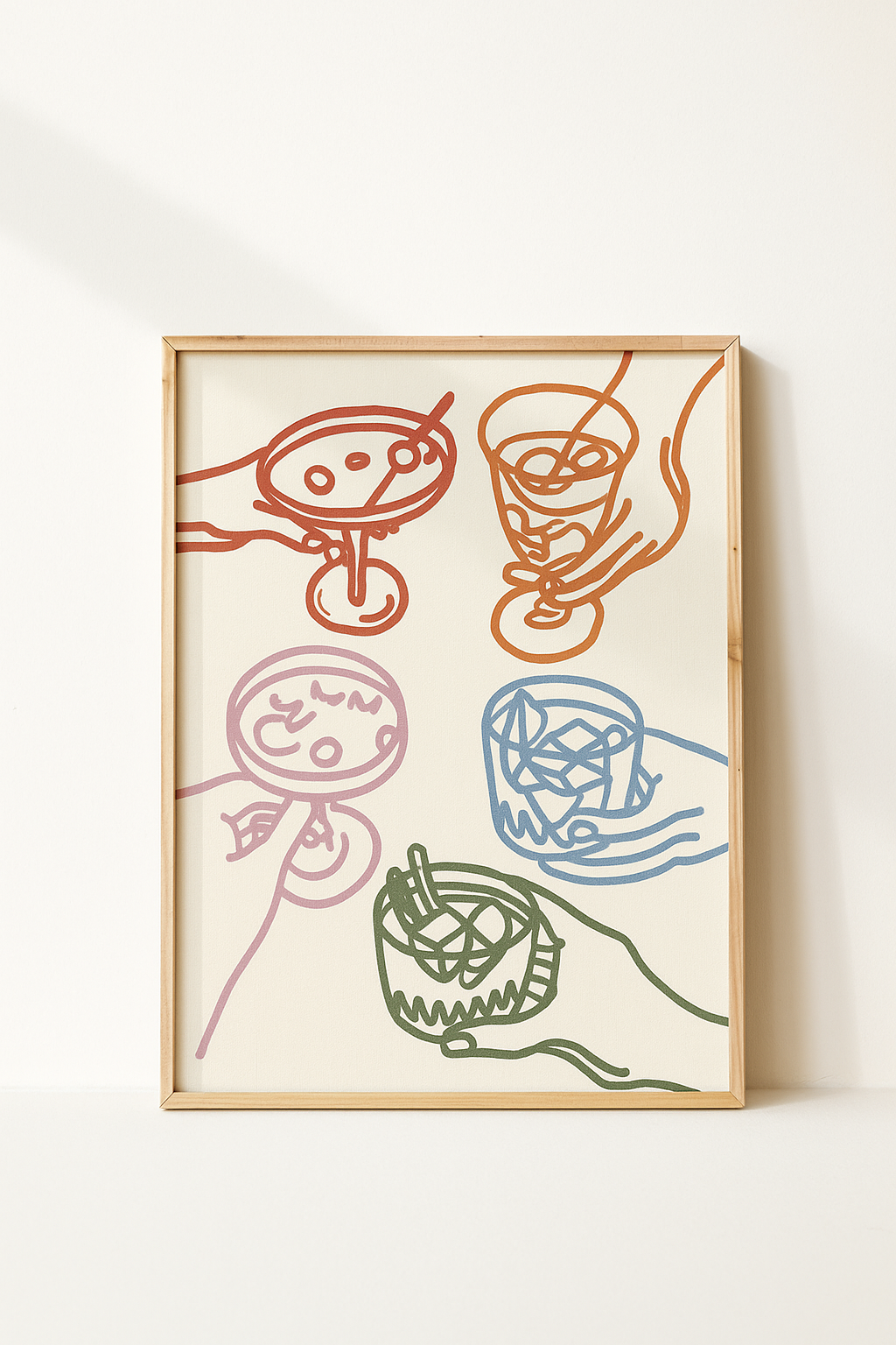 Una stampa su tela dal design giocoso e moderno che raffigura una serie di bicchieri illustrati con linee continue e colori vivaci. Perfetta per aggiungere un tocco artistico e leggero alla cucina, al soggiorno o alla zona pranzo.